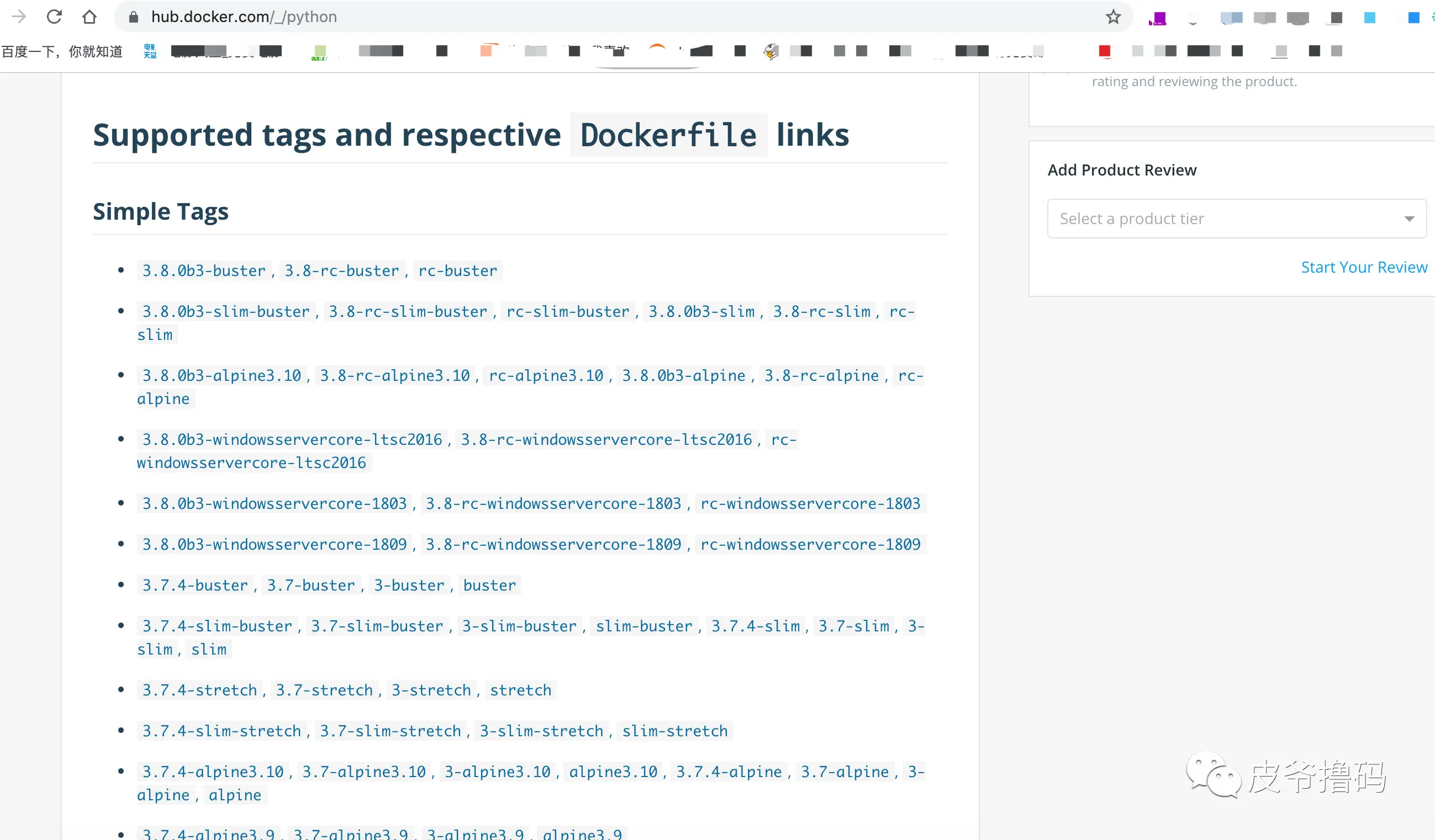 可以看到,这里全是 Python 的 Tags。所以,如果我们将来不论是写 Dockerfile 还是写 docker-compose.yml 文件,FROM 字段和 IMAGE 字段之后的内容,都可以来 hub.docker.com 这里来找。