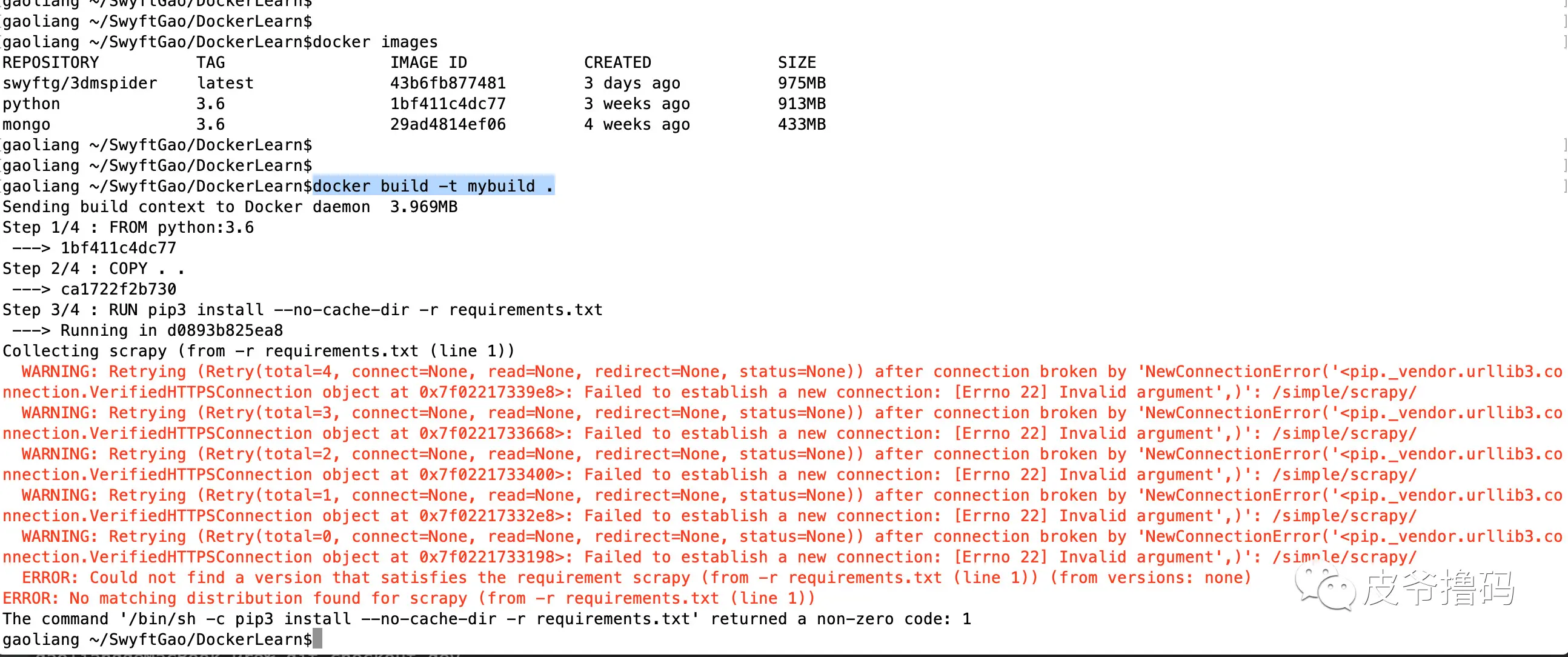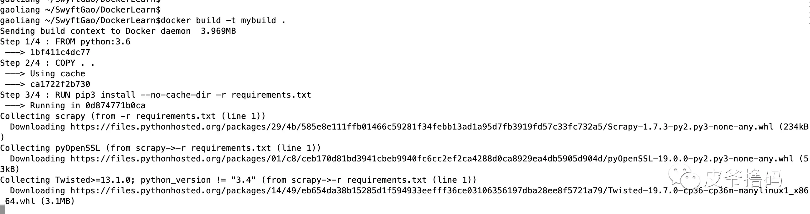 FROM代表你现在的Image是需要在哪个Docker Image之上运行的。我们这里本地是Python3.6,Scrapy爬虫也是在 Python3.6的环境里面跑的,所以我们这里就FROM python:3.6,注意,最后那里有:3.6版本号标注。如果不标注,Docker 则会自动使用latest版本来编译。 - 第二行,很简单,就是说将当前目录下的代码,拷贝到 Image 里面,这里也就是