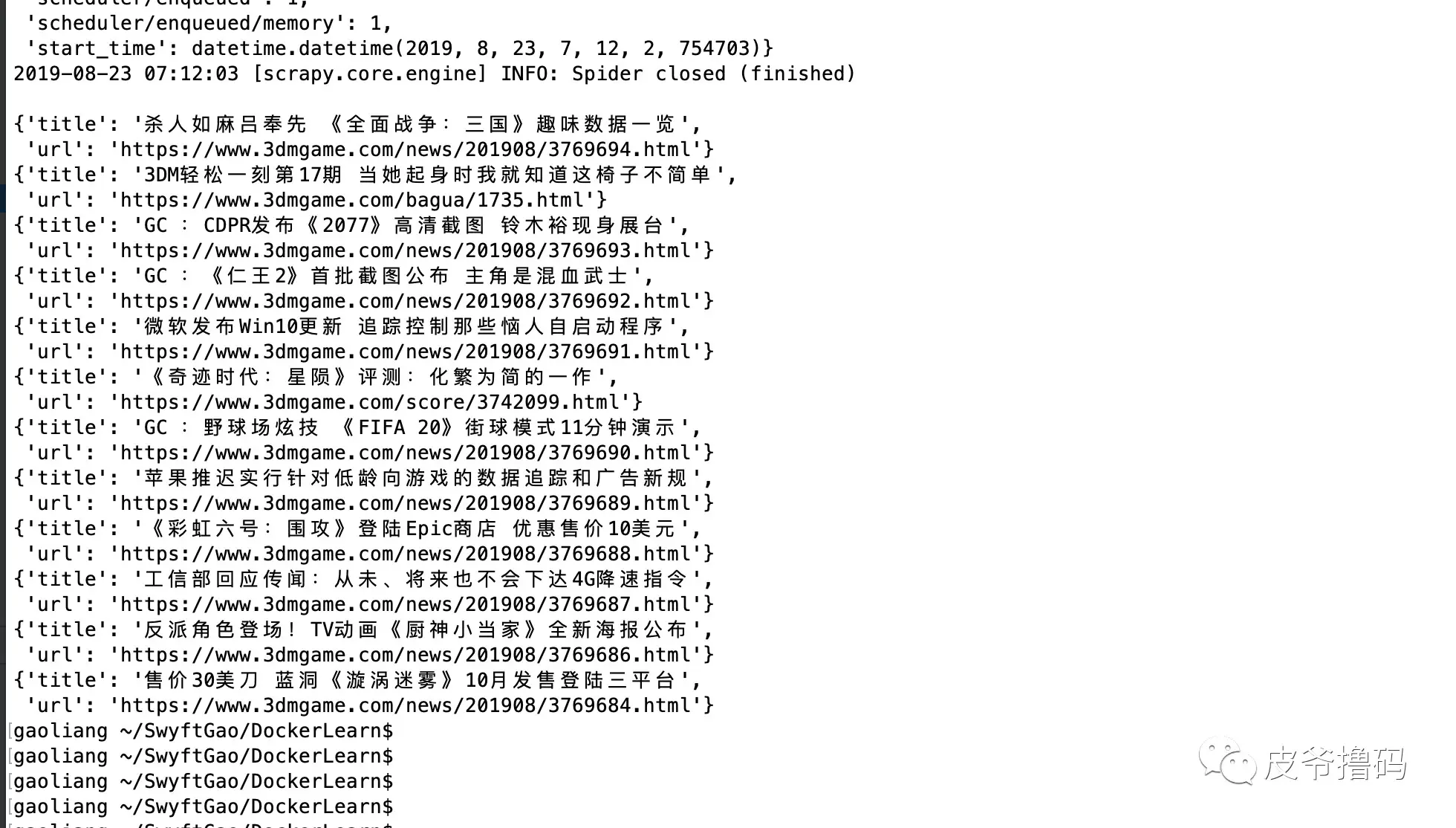 OK,可以看到 3dm 的新闻信息已经打印出来了,很完美。接下来我们需要把这个 Image 放到 DockerHub 上让大家使用了。