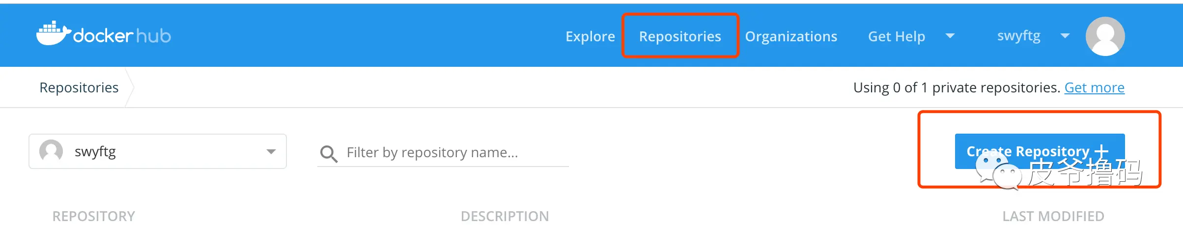 成功注册之后,我们登录。登录 完成之后,我们点击最上面导航栏里面的 Repositorys,然后点击 Create Repository: