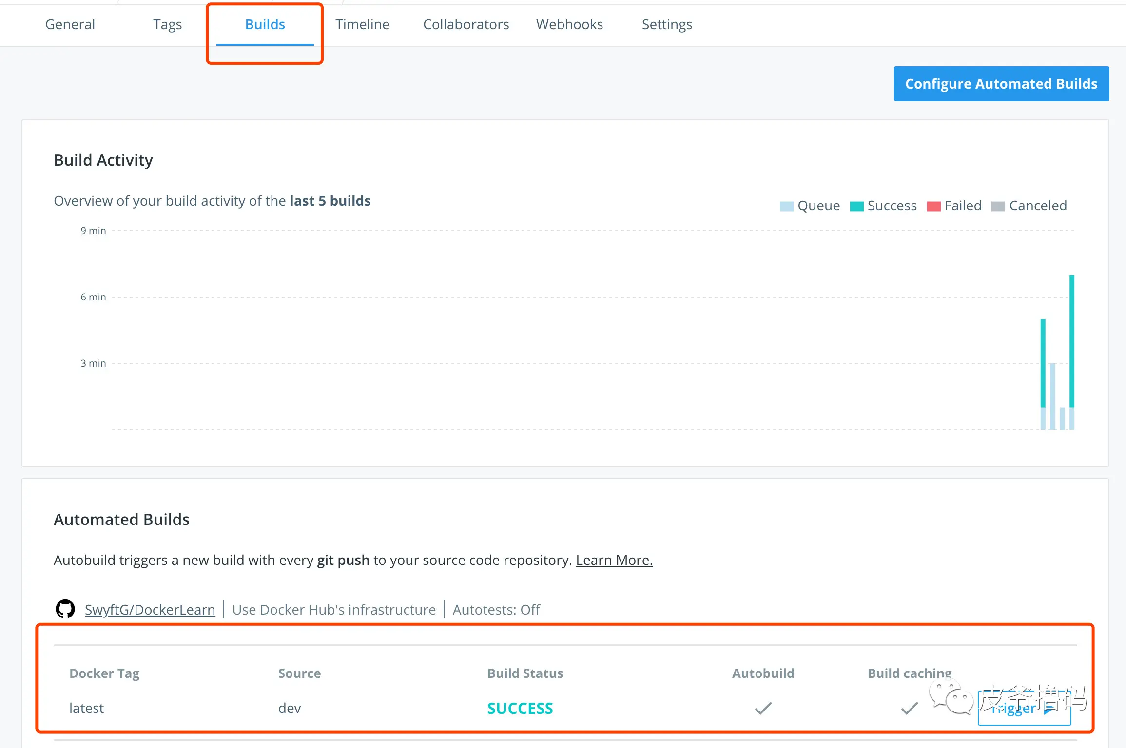 如果想看 Build 信息,就在 Build 里面看。如果你的代码做了修改,然后也在 GitHub 上更新了代码,你想重新 Build 一下你的 Docker Image,那么你在 Build 里面也可以设置选项,来重新 Build 你的 Image。
