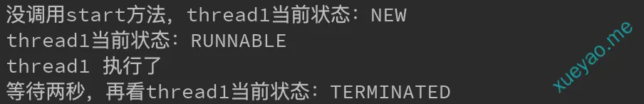 System.out.println("没调用start方法,thread1当前状态:" + thread1.getState().toString());
