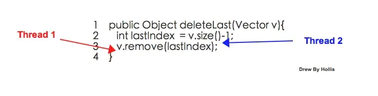 上面这个方法是一个复合方法,包括size()和remove(),乍一看上去好像并没有什么问题,无论是size()方法还是remove()方法都是线程安全的,那么整个deleteLast方法应该也是线程安全的。