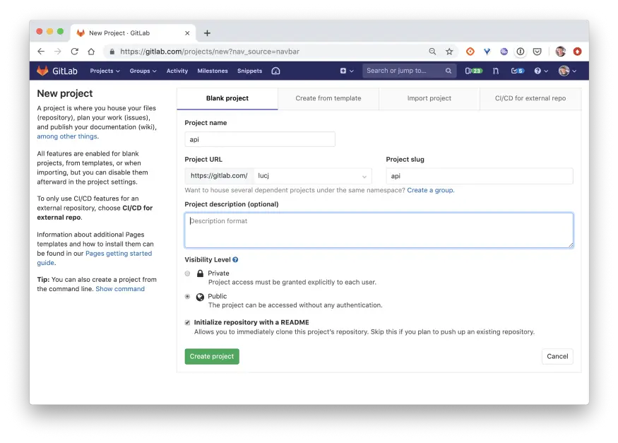 在安装k3s之前,我们先在Gitlab上创建一个新的项目,称为api。