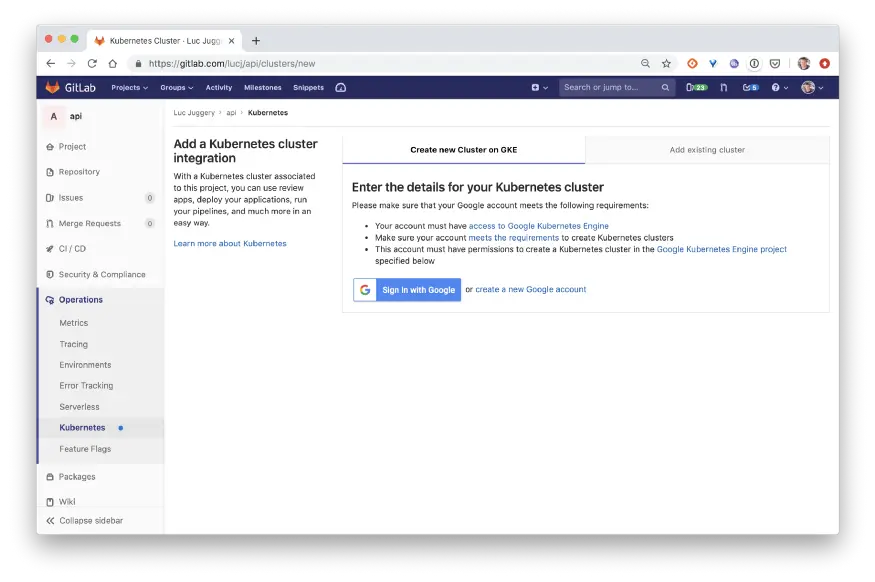 注意:在当前版本的GitLab中,新集群的创建仅限于GKE。