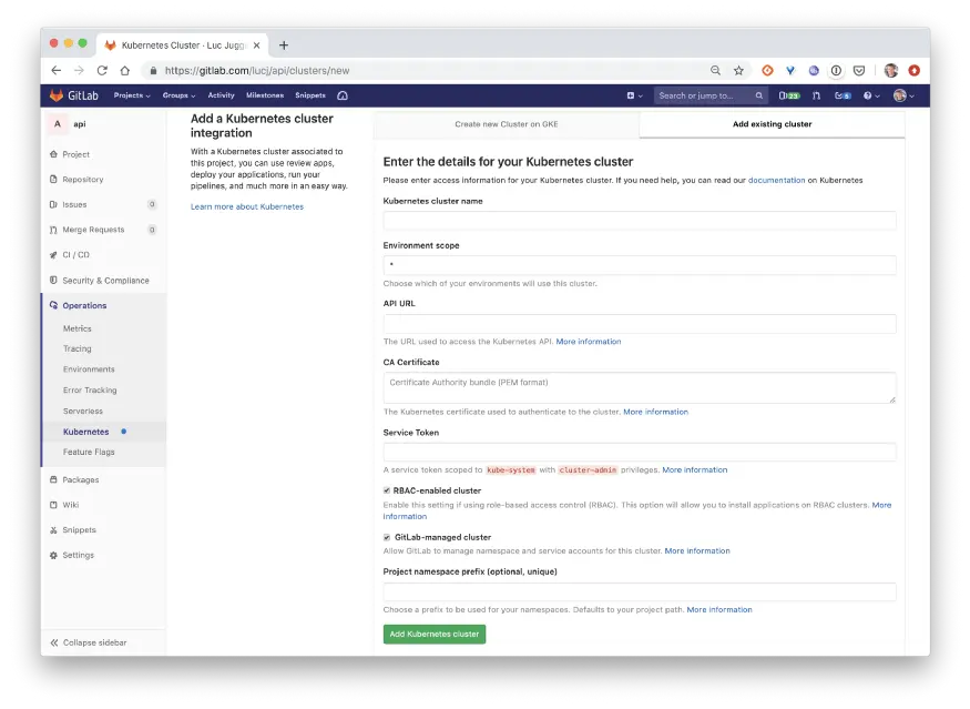 $ TOKEN=$(kubectl -n kube-system get secret $SECRET -o jsonpath='{.data.token}' | base64 --decode)$ echo $TOKEN我们已经完成了所有设置,现在回到之前打开的选项卡中,开始使用所有信息并填写Gitlab 【Add existing cluster 】表单的字段: