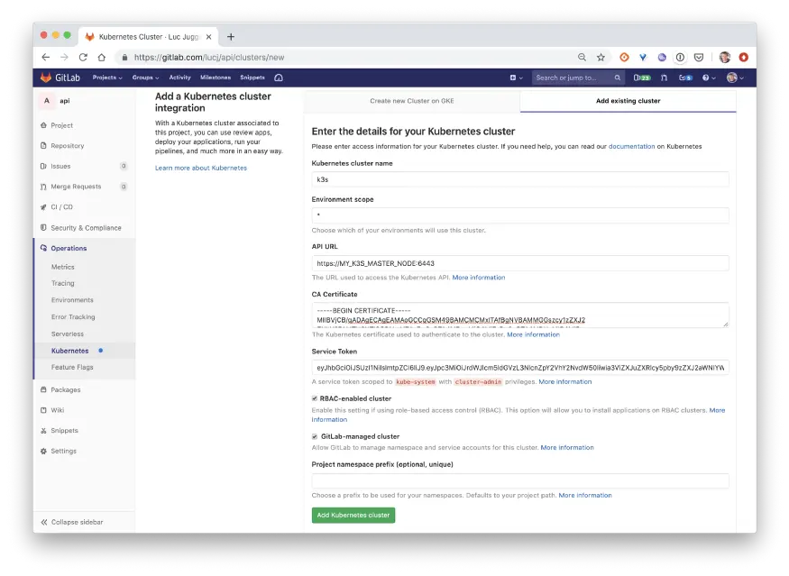 现在让我们获取在Gitlab项目中集成全新的k3s集群所需的所有信息。