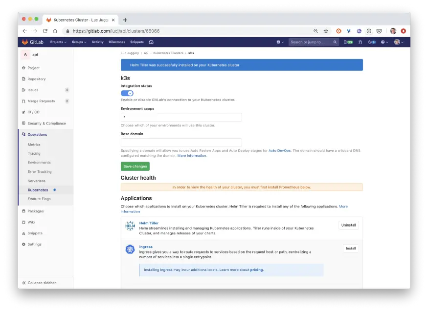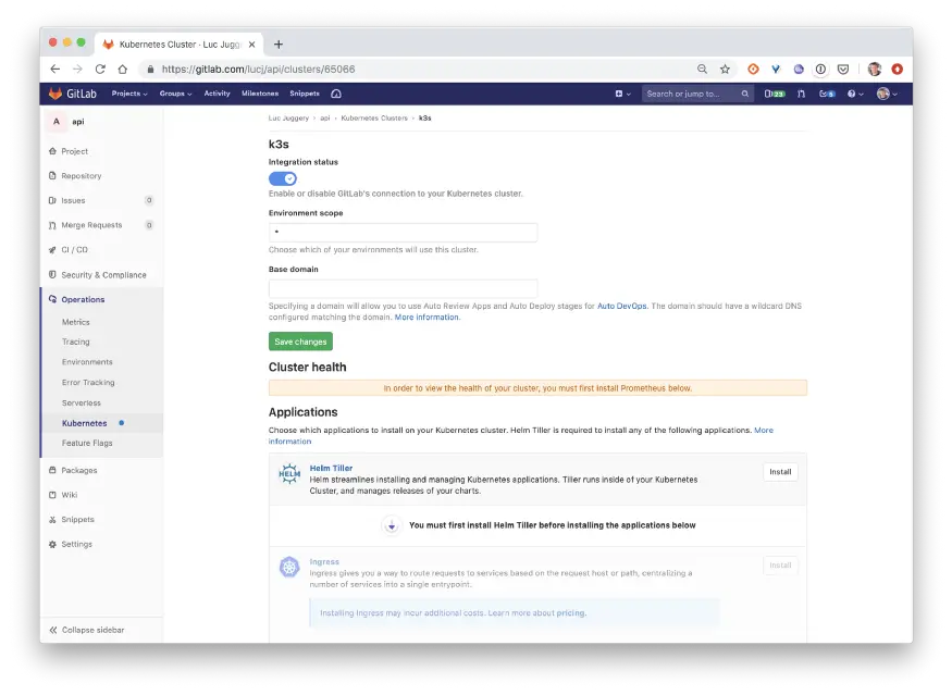 $ curl -sfL https://get.k3s.io | K3S_URL=https://myserver:6443 K3S_TOKEN=XXX sh -在Gitlab中集成