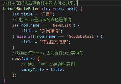 .then( this.$axios.spread( (imgRes,infoRes)=>{ this.imgs = imgRes.data.message; this.info = infoRes.data.message[0]; }) )不同的列表页,跳转到同一个详情页,对title的更改(设置路由,确认路由过来后设置)