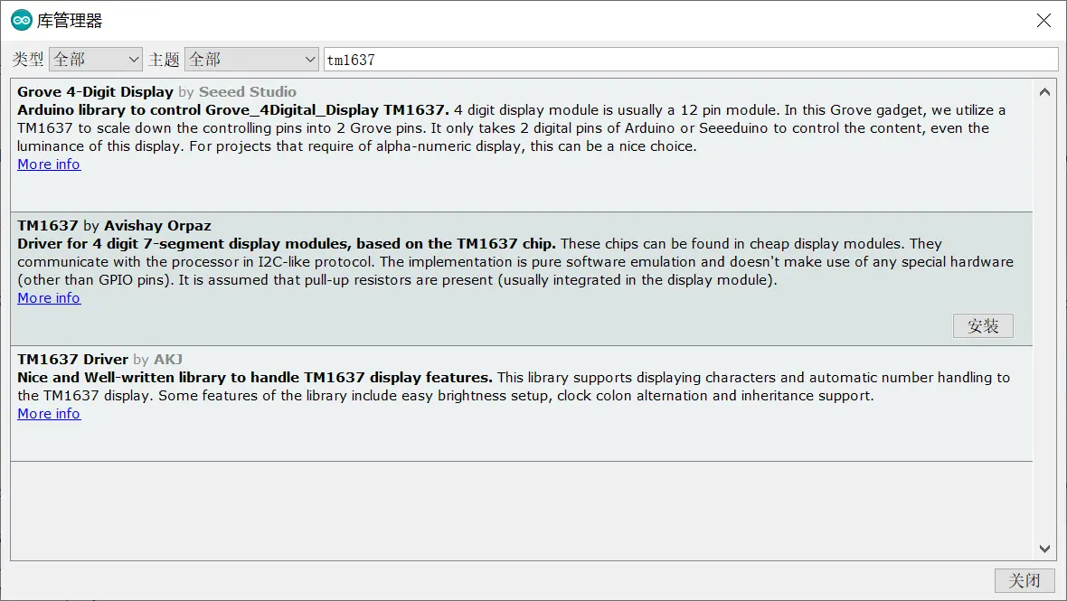 打开库管理器,搜索tm1637,按照下图所示,点击安装。