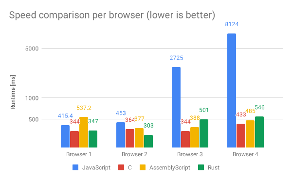 无需过多地分析这两张图表,就可以清楚地看到我们解决了最初的性能问题:所有 WebAssembly 模块的运行时间都在大约 500ms 或更少。这证实了我们在一开始的论调: WebAssembly 提供了可预测的性能。无论我们选择哪种语言,耗时都是最小的。准确地说:JavaScript 在所有浏览器上的标准耗时是大约 400ms,而我们所有 WebAssembly 模块在所有浏览器上的标准耗时是大约 80ms。