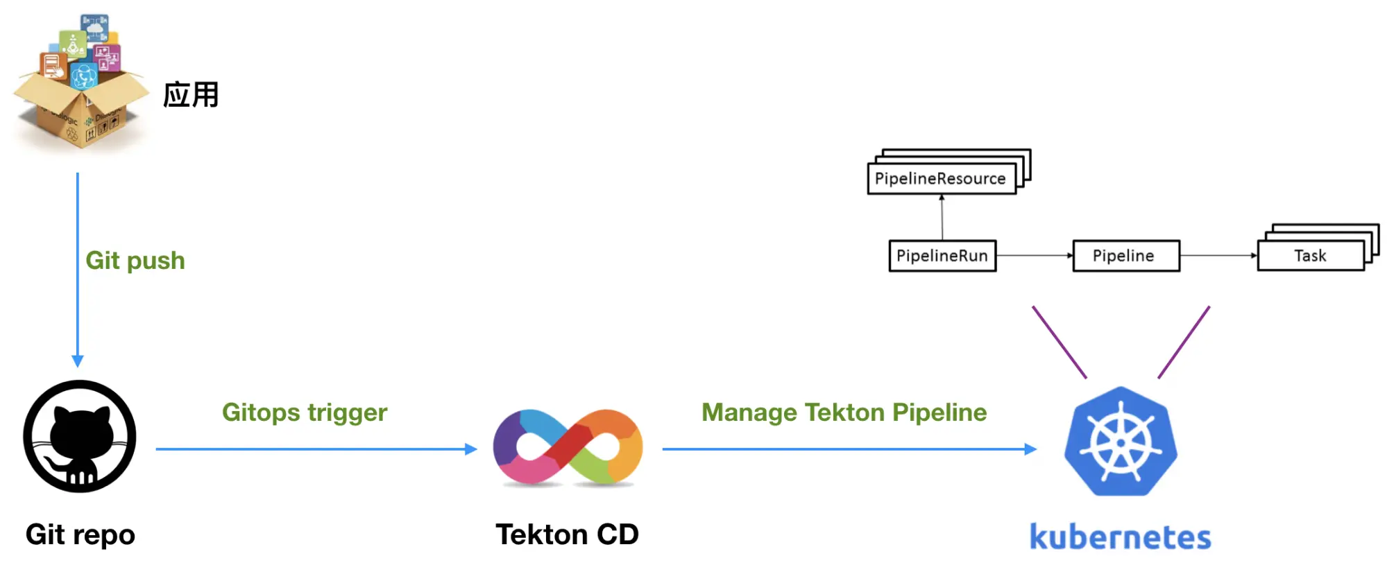 - 如果 Git 改动里有一个应用 YAML 且该应用不存在,那么将渲染和生成 Tekton Pipelines 用来创建应用。