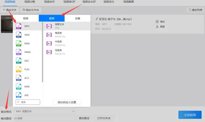 2、添加好视频格式后调整“输出格式”,在调整输出格式时先将输出的格式设置为“音频”格式,又因为要把mp4视频格式转换成mp3格式,所以要把音频格式设置为‘mp3’格式。而音频格式的参数可以根据需要进行调整。