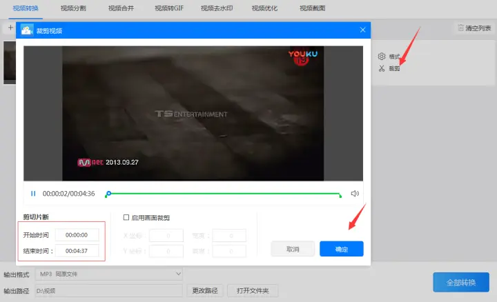 3、调整完“输出格式”的各项参数后可以截取视频输出的片段,截取时点击‘裁剪’按钮根据矩形框设置保存的区间(开始时间和结束时间)。设置完后点击‘确定’保存截取的区间。如果不需要裁剪片段而要保存完整视频可以忽略此步骤。