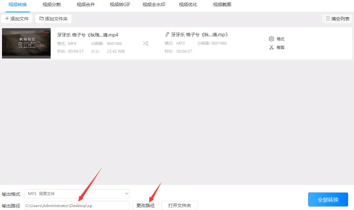 5、修改好“输出路径”后点击‘转换’或‘全部转换’按钮把mp4视频格式转换成mp3音频格式。等待片刻格式转换好后点击覆盖在“转换”按钮上的“打开”按钮就可以找到转换后的mp3格式了。