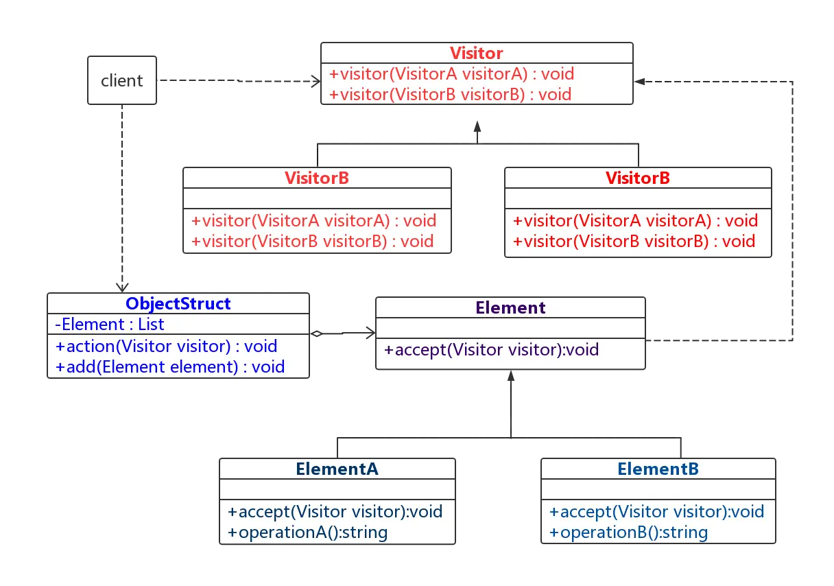 (1) Vistor(抽象访问者):为该对象结构中具体元素角色声明一个访问操作接口。就好像是王者荣耀里面不同的玩家。