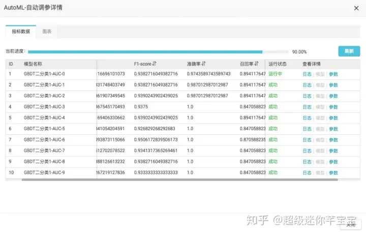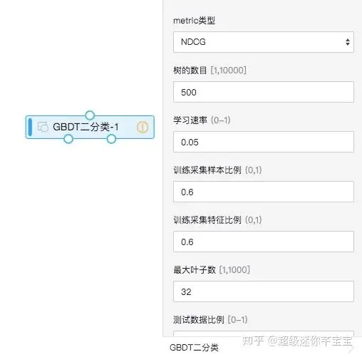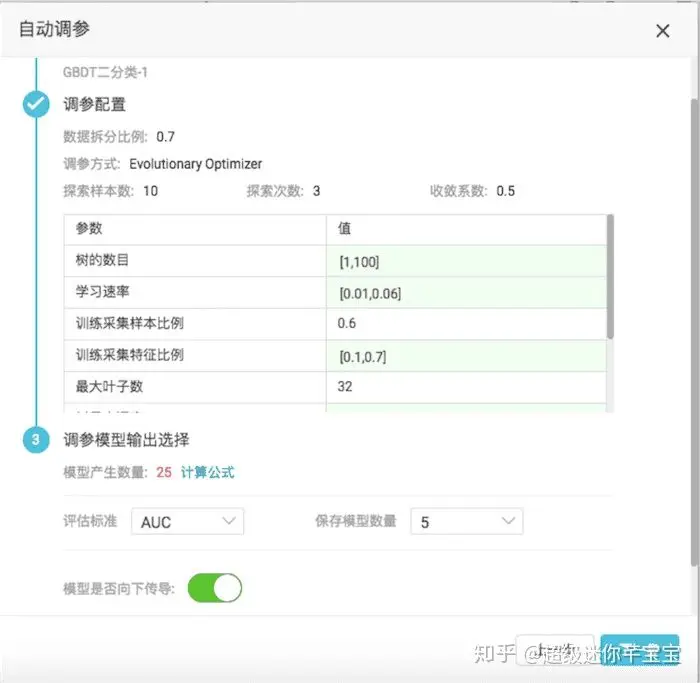 二分类算法如果在PAI平台选用GBDT或者RF这些算法需要有大量的参数调节,而且每个参数都具有很广的定义域,光靠人工手动调节很难锁定最优的参数组合。如下图,仅树的数目这一个参数就有[1,10000]这1万种参数可能性。