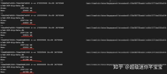 此时这些mmap file 虚拟内存是2G,但是物理内存是0(因为我之前重启过,调低过内存防止进程挂掉影响问题排查)。