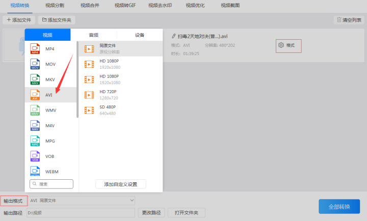 2、视频添加好后调整视频“输出格式”中输出的视频格式,因为要把qlv格式转换成avi格式,所以把输出的“视频格式”设置为‘avi’格式。