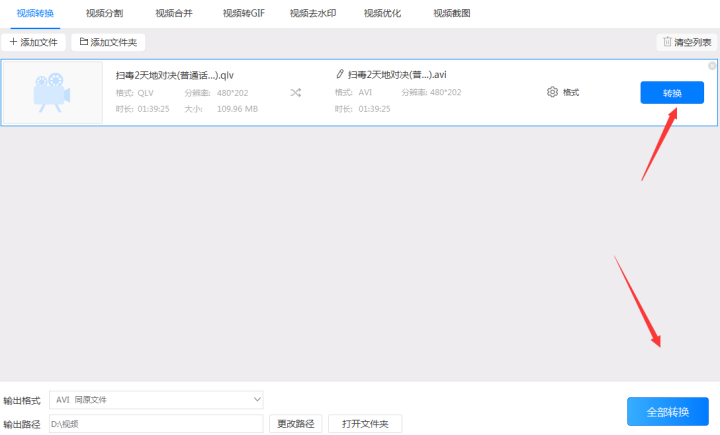4、设置好输出路径后可以依次点击“转换”按钮依次转换视频格式,也可以直接点击右软件下角的“全部转换”按钮统一把qlv格式转换成avi。