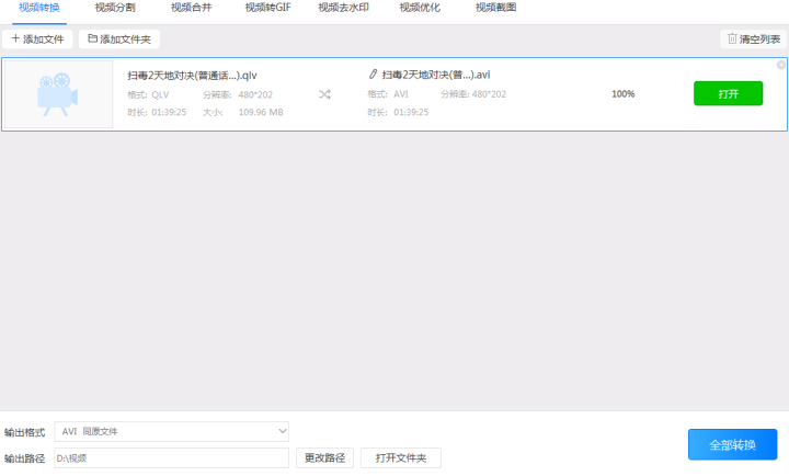 5、在转换时软件会有一个进度条,当进度条到达100%时就表示软件已经成功把qlv格式转换成avi了。最后我们只需要找到之前预设的输出路径(D:\视频)就可以找到转换后的avi格式的视频了。