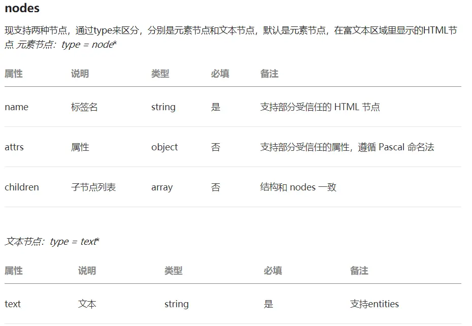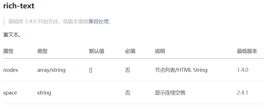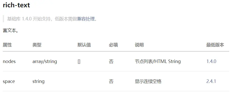 <rich-text nodes="{{nodes}}" bindtap="tap"></rich-text>Page({ data: { nodes: [{ name: 'div', attrs: { class: 'div_class', style: 'line-height: 60px; color: red;' }, children: [{ type: 'text', text: 'Hello World!' }] }] }, tap() { console.log('tap') } })