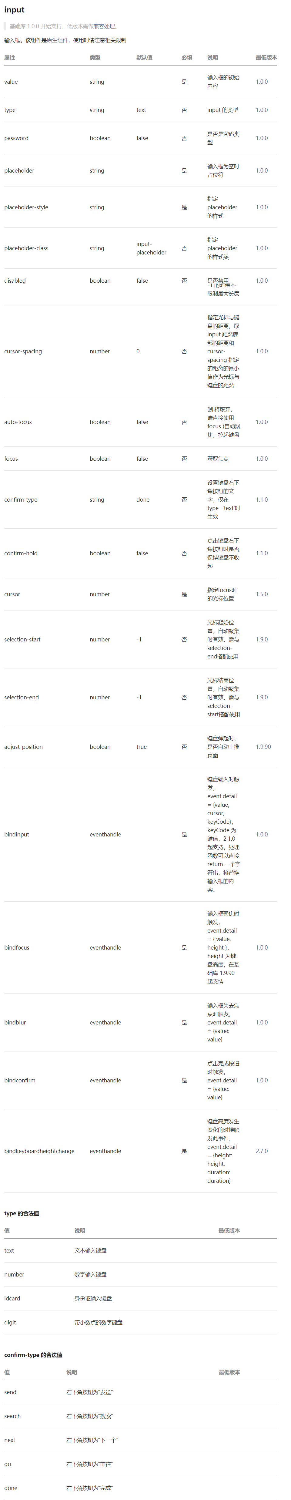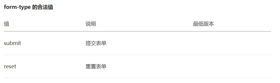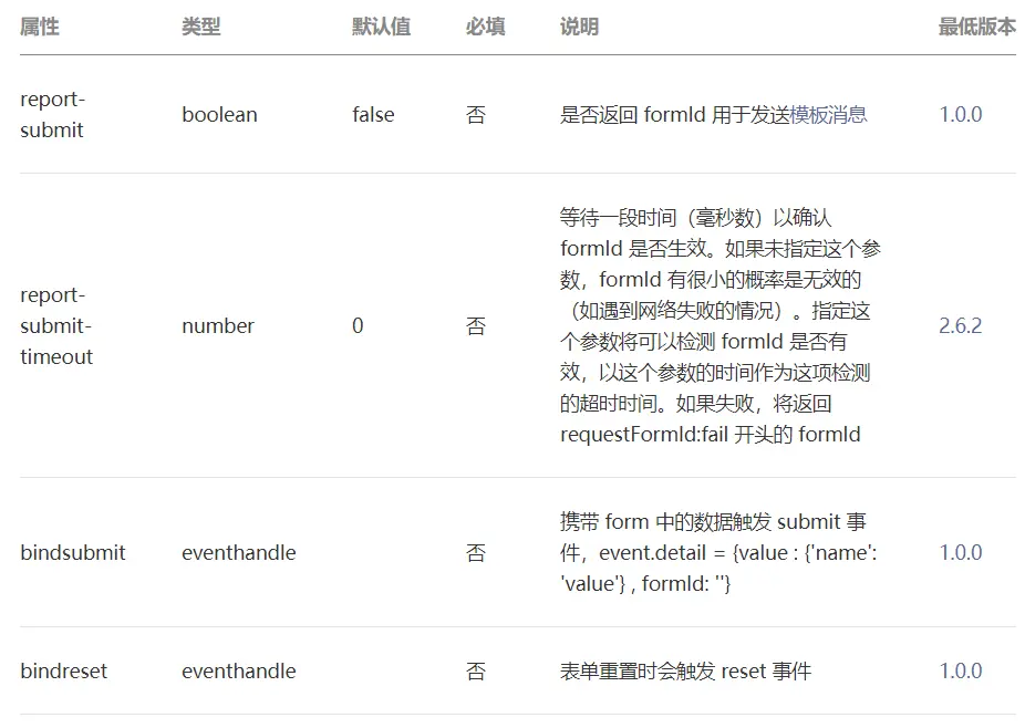 表单。将组件内的用户输入的switch input checkbox slider radio picker 提交。当点击 form 表单中 form-type 为 submit 的 button 组件时,会将表单组件中的value 值进行提交,需要在表单组件中加上 name 来作为 key