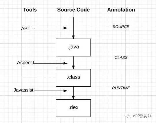 注解处理器 Java5 中叫APT(Annotation Processing Tool),在Java6开始,规范化为 Pluggable Annotation Processing。Apt应该是这其中我们最常见到的了,难度也最低。定义编译期的注解,再通过继承Proccesor实现代码生成逻辑,实现了编译期生成代码的逻辑。