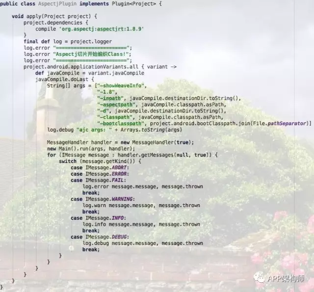 2、自定义一个gradle插件,使用 AspectJ 的编译器(ajc,一个java编译器的扩展),对所有受 aspect 影响的类进行织入,在 gradle 的编译 task 中增加额外配置,使之能正确编译运行。