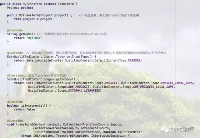 Javassist作用是在编译器间修改class文件,与之相似的ASM(热修复框架女娲)也有这个功能,可以让我们直接修改编译后的class二进制代码,首先我们得知道什么时候编译完成,并且我们要赶在class文件被转化为dex文件之前去修改。在Transfrom这个api出来之前,想要在项目被打包成dex之前对class进行操作,必须自定义一个Task,然后插入到predex或者dex之前,在自定义的Task中可以使用javassist或者asm对class进行操作。而Transform则更为方便,Transfrom会有他自己的执行时机,不需要我们插入到某个Task前面。Tranfrom一经注册便会自动添加到Task执行序列中,并且正好是项目被打包成dex之前。