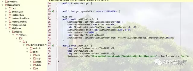 修改后的class文件在build/intermediates/transforms/MyTrans下可以看到