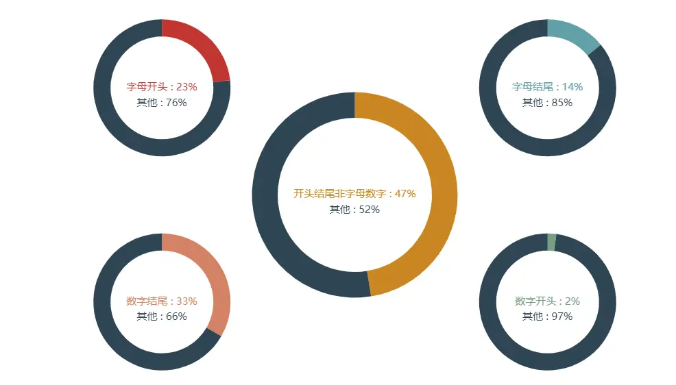以数字开头的用户非常少,很符合逻辑。而以数字结尾的人占了三成有余,而以字母或数字作为开头或结尾的人数竟达到了一半,一般情况下只有用户名不可重复的以昵称作为账号的平台才会出现这种情况。