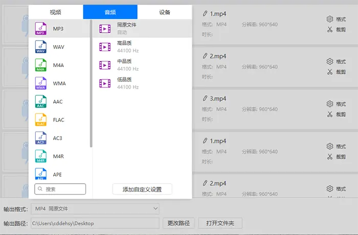 3、然后在软件左下方的输出格式中选择一个音频输出,我们这里选择输出mp3视频格式,所以选择mp3格式,然后再选择一个音频的品质,这个类似视频的分辨率,音频的品质越高越大,那么音频质量则越好。