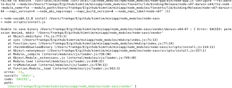 Unable to save binary /Users/frankgo/E/github//miniapp/node_modules/node-sass/vendor/darwin-x64-67 : { Error: EACCES: permission denied, mkdir '/Users/frankgo/E/github//miniapp/node_modules/node-sass/vendor'
