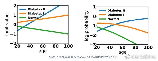 本文首先讨论了在多分类问题的下,传统可解释性算法(例如逻辑回归,SVM)的可视化图像与模型的预测机制之间存在的矛盾。如果直接通过这些未经加工的可视化图像理解模型预测机制,有可能造成建模人员对模型预测机制的错误解读。如图1所示,左边是在一个多分类GAM下age的shape function。粗看之下这张图表示了Diabetes I的风险随年龄增长而增加。然而当我们看实际的预测概率(右图),Diabetes I的风险其实应该是随着年龄的增加而降低的。