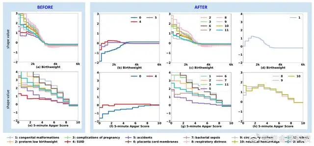 在一个预测婴儿死因的数据上(12类分类问题),我们采用API对shapefunction做了处理,从而使得他们能真实地反应预测概率变化的趋势。这里可以看到,在采用API之前,模型可视化提供的信息是所有死因都和婴儿体重和Apgar值成负相关趋势。但是在采用API之后我们发现,实际上不同的死因与婴儿体重和Apgar值的关系