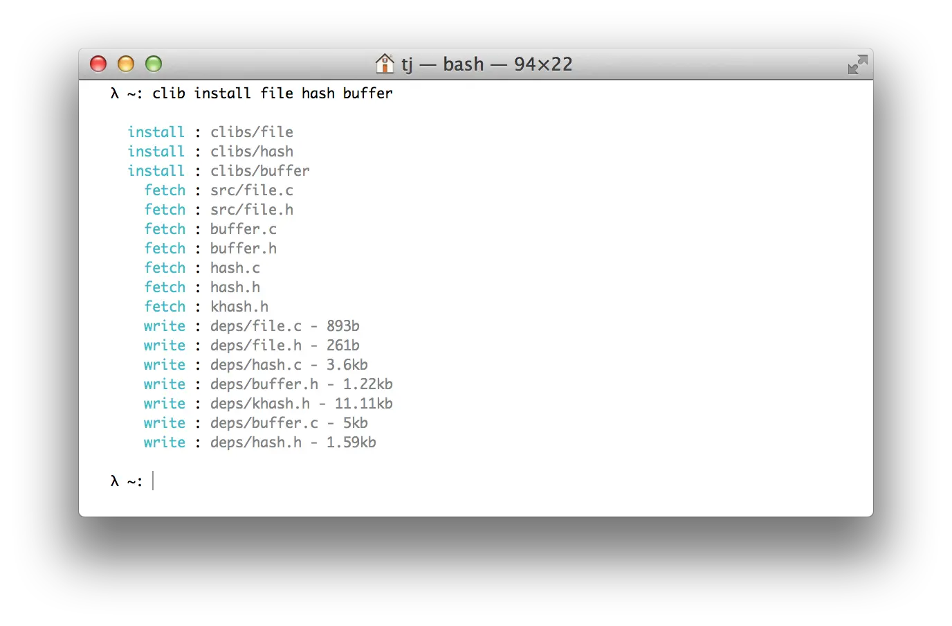 clib 是一个 C 包管理器(非 C++),使用起来较简单。同样的,它也可以直接从 GitHub 上安装库。类似于 Node.js,它也是用 package.json 管理的。下面是一个例子:
