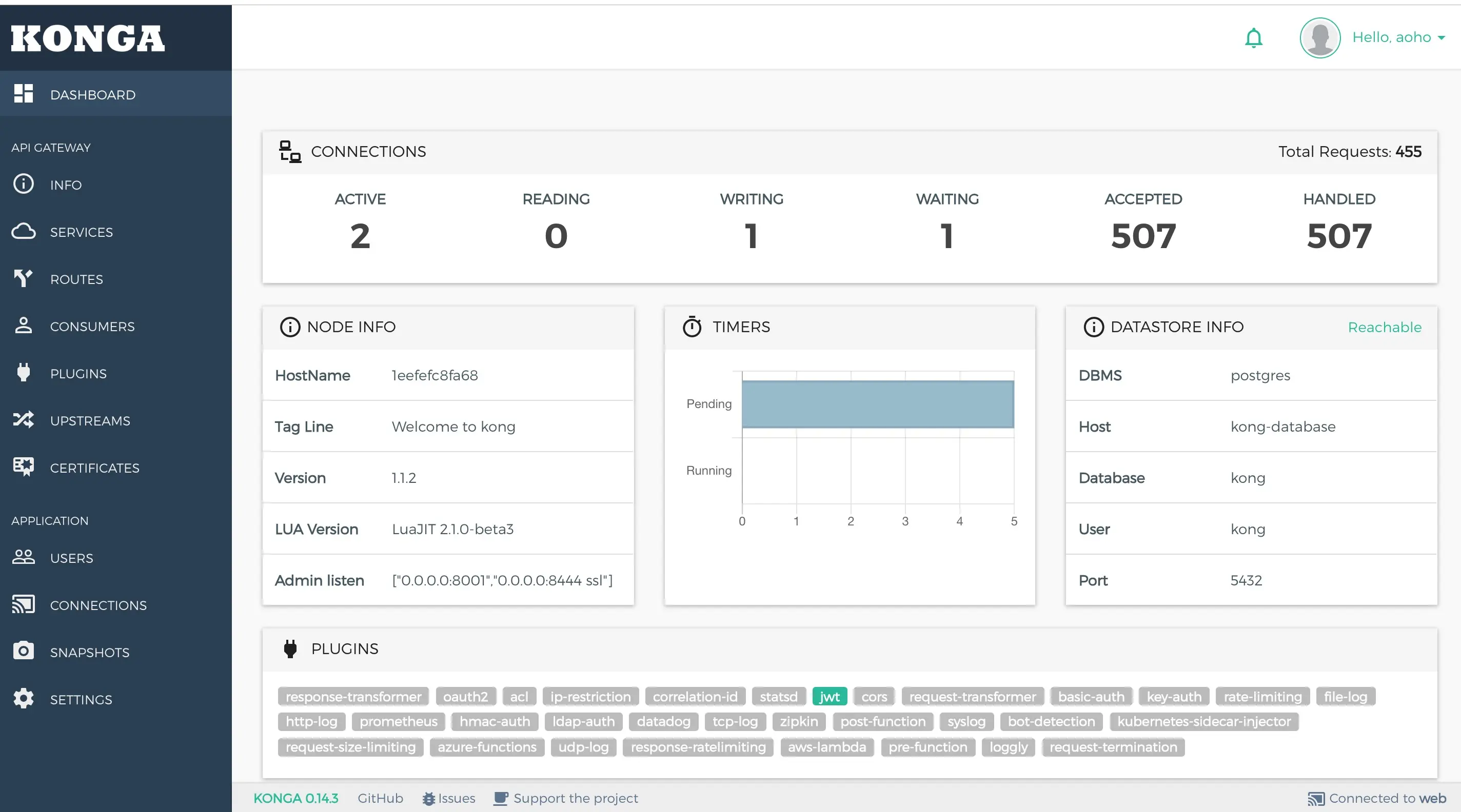 - Kong dashboard:官方推荐 UI 管理工具,当然,也可以使用 restfull 方式管理 admin api。