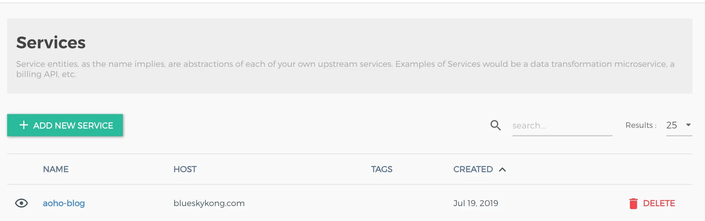 我们创建一个服务名为 aoho-blog,指定转发的地址为 http://blueskykong.com。可以在管理界面中看到如下的记录: