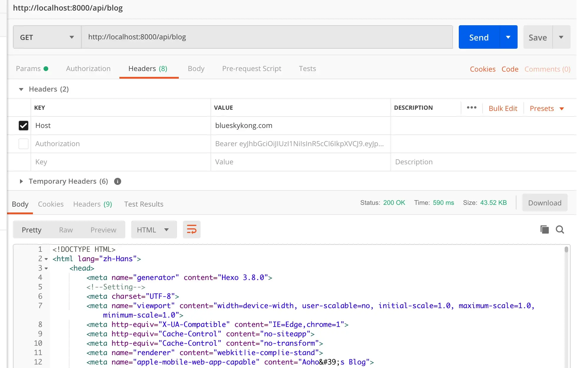 Kong 默认通过 8000 端口处理代理的请求。成功的响应意味着 Kong 将 http://localhost:8000 的请求转发到配置的 URL,并将响应转发给我们。需要注意的是,如果 API 暴露的地址与前面 Host 定义的地址(blueskykong.com)不一致,就需要在请求的 Headers 里面加入 Header,Kong 根据上面请求中定义的 Header:Host,执行此操作。