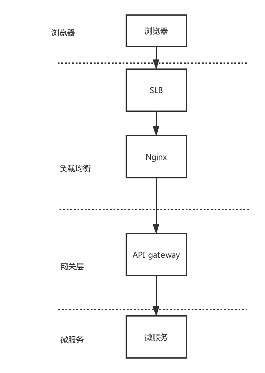 通过域名访问,在整个后端的访问路径如下图,大致分四个部分,浏览器、负载均衡层、网关层、服务层。 域名解析这里忽略不讨论了。