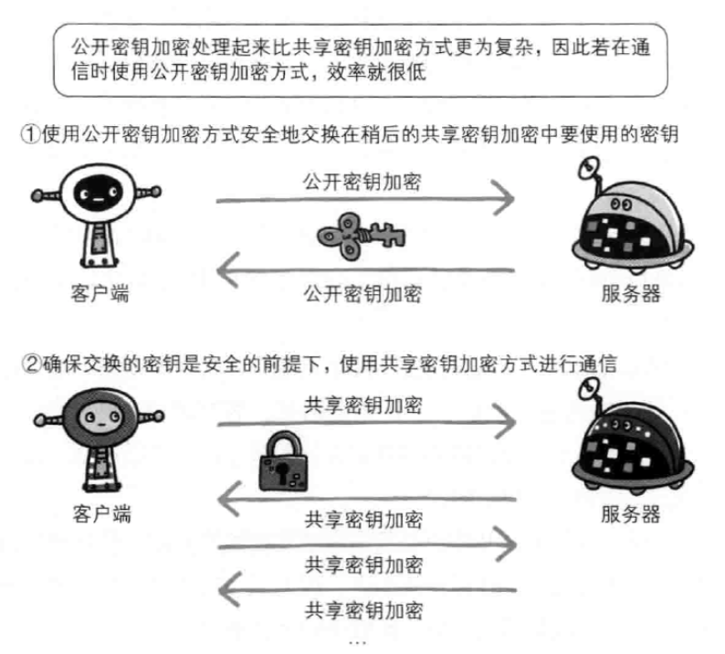 HTTPS采用共享密钥加密和公开密钥加密的混合加密机制。如果为了实现密钥的安全,那么可以考虑仅使用公开密钥加密技术。(公开密钥加密比共享密钥加密处理速度要慢) 所以,应当充分利用两者的优势,将多种方法组合起来进行通信: 在交换密钥环节,使用公开密钥加密技术(比如说,从客户端到服务器,那么在这样一个安全的通信中,客户端可以将共享密钥加密中的密钥用公开密钥加密中的公钥进行加密,发送给服务器,然后服务器使用公开密钥加密技术的私钥进行解密,就拿到了共享密钥加密技术中的私钥),之后建立通信报文交换的阶段则可使用共享密钥加密技术。