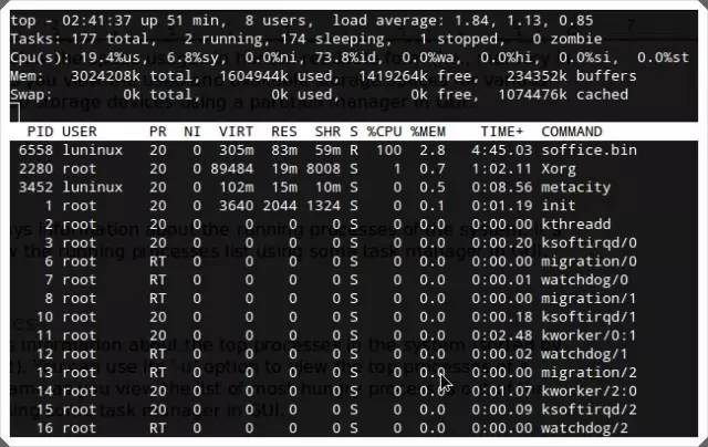 top命令会默认按照CPU的占用情况,显示占用量较大的进程,可以使用top -u <username>查看某个用户的CPU使用排名情况。