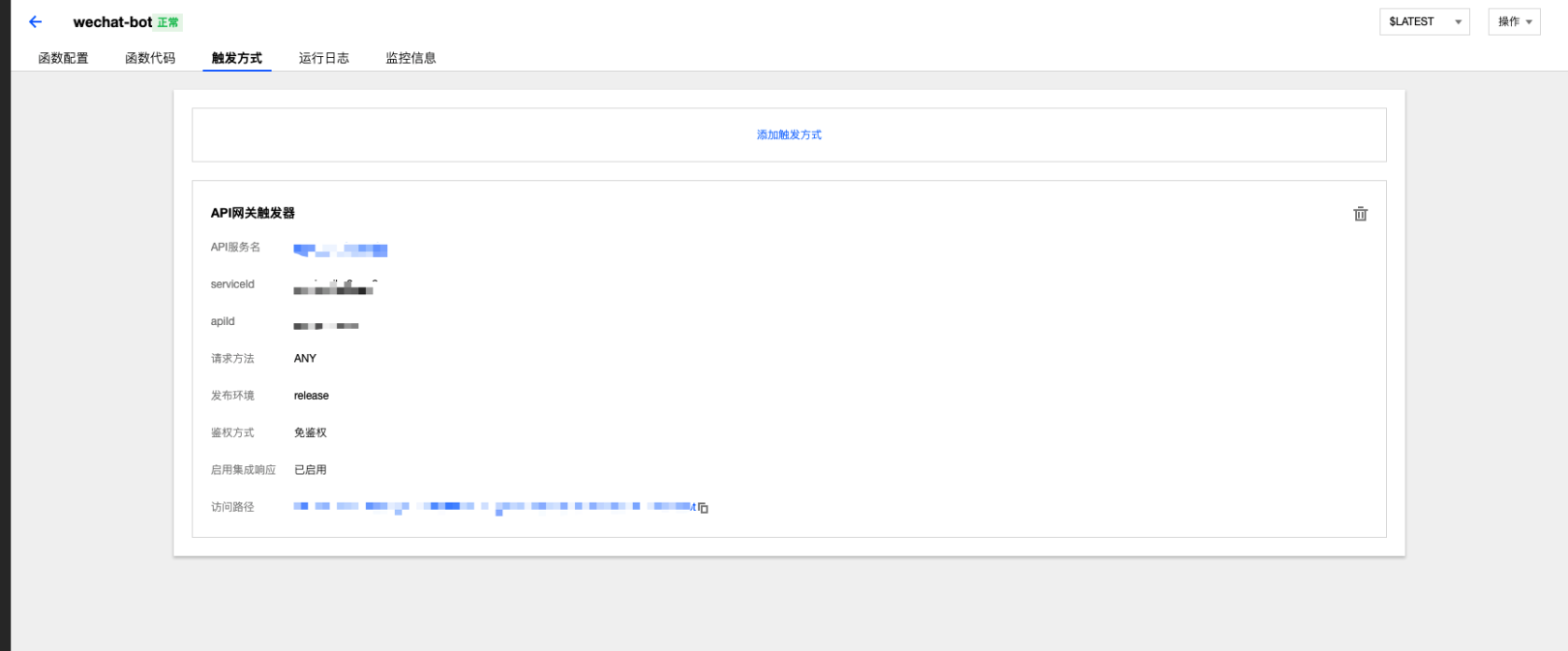 那一个配有API网关触发器的云函数就创建完成了。访问API网关触发器下面的访问路径,即可触发该云函数运行。