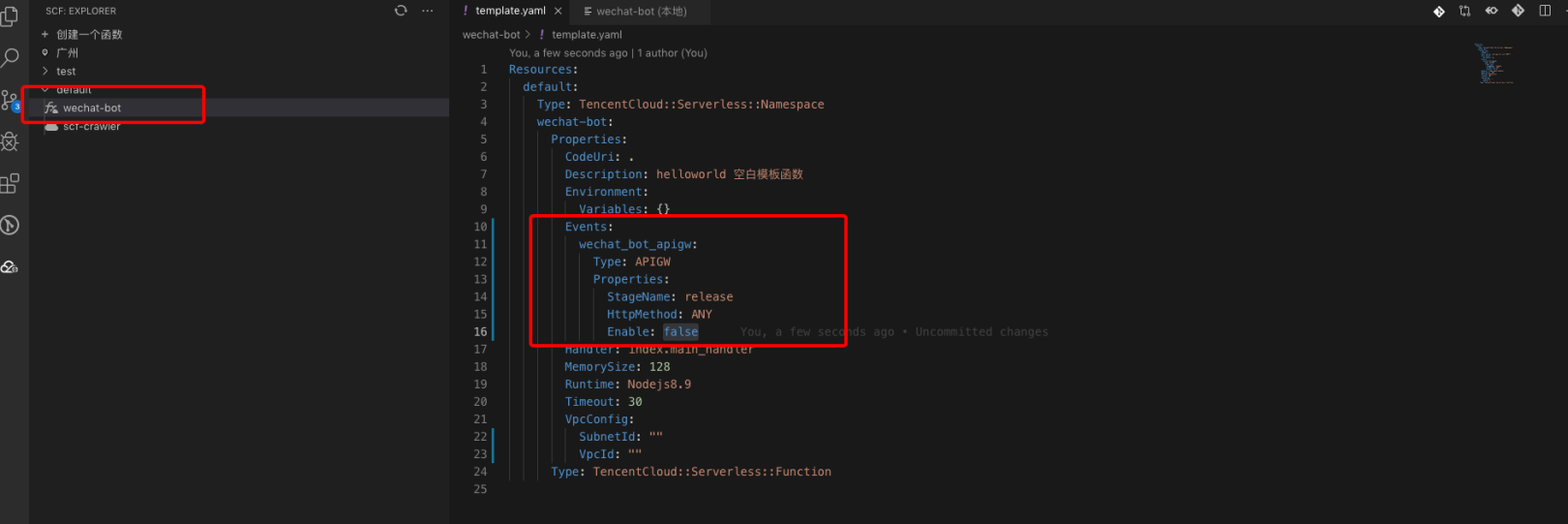 先用Tencent Serverless Toolkit for VS Code这个VS Code插件生成一个云函数。并根据该文档修改下template.yaml,配置API网关触发器。