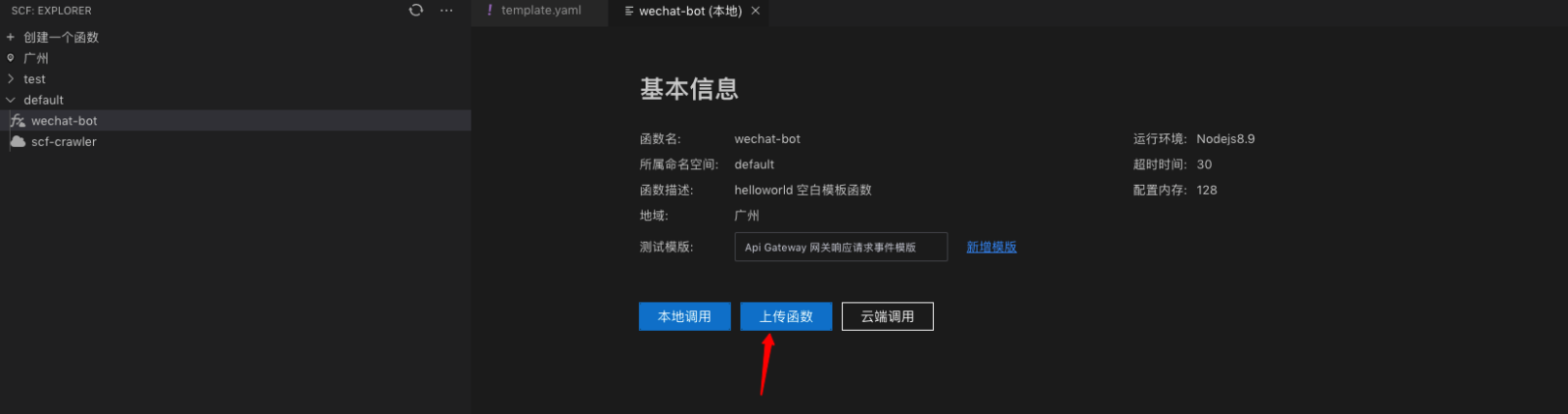 去到函数的面板,点击上传函数,等待上传完成,就可以在控制台看到了函数部署上去了。