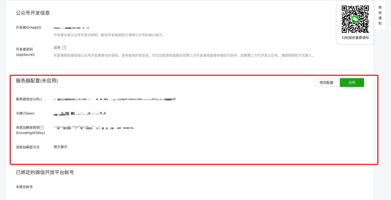 消息加解密方式:这个大家看自己需求选择,我这里就选个明文模式。