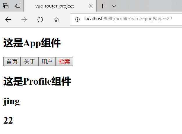 <router-link :to="{path:'/profile',query:{name:'jing',age:22}}" replace tag="button">档案</router-link>