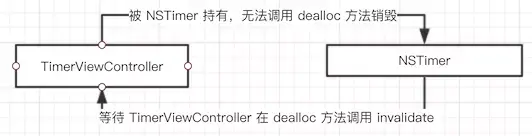 TimerViewController 需要 NSTimer 同生共死。NSTimer 需要在 TimerViewController 的 dealloc 方法被 invalidate 。NSTimer 被 invalidate 的前提是 TimerViewController 被 dealloc。而 NSTimer 一直强引用着 TimerViewController 导致 TimerViewController 无法调用 dealloc 方法。