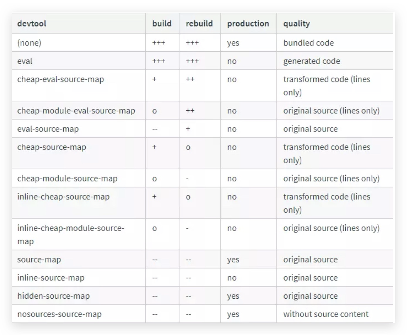 SourceMap 的可选值如下(+ 号越多,代表速度越快,- 号越多,代表速度越慢, o 代表中等速度 )